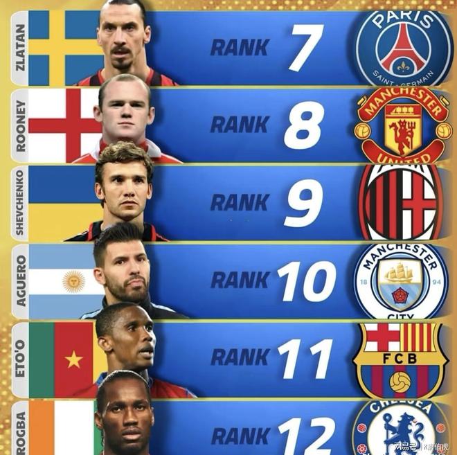 伊布的排名应该直接垫底,毕竟他四处流浪的后果就是没有取得过任何拿得出手的团队荣誉,当然其个人能力依旧值得肯定。就鲁尼、阿圭罗而言他均毫无优势,如果拿德罗巴和埃托奥来对比就更没有什么骄傲之处。